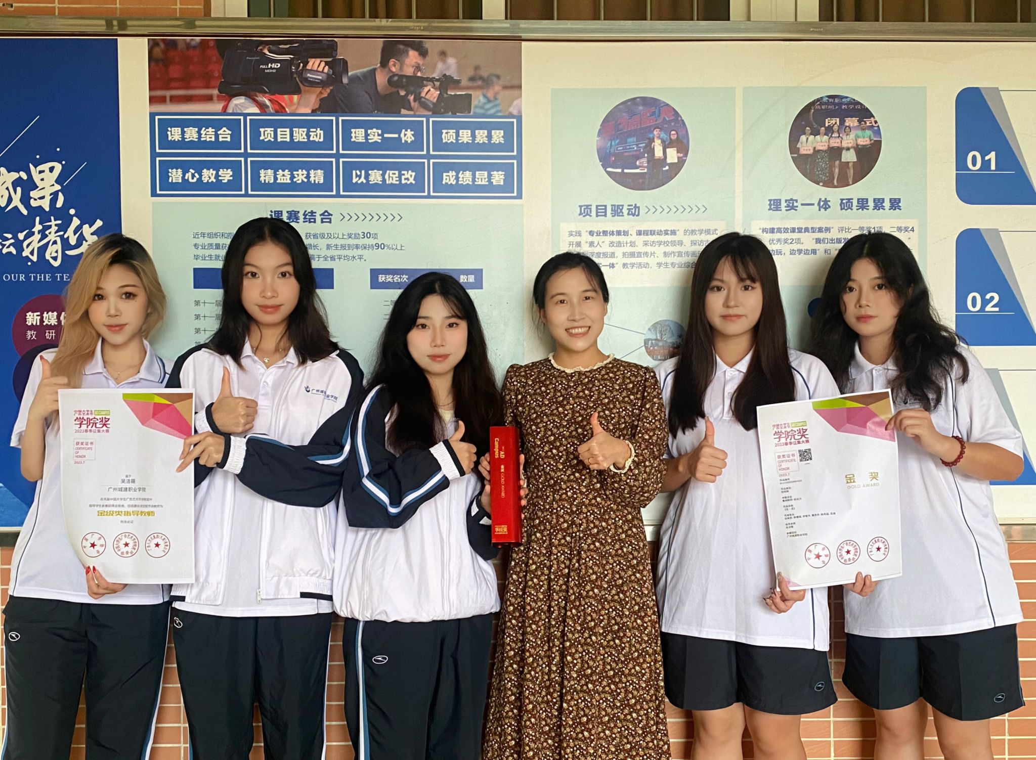 4.团队队伍:本专业拥有一支职称结构合理、学科背景多元、专兼结合的团队队伍,专任教师包括数字媒体技术、新闻传播学、戏剧与影视学、设计学、美术学、公共管理等相关学科。现有专任教师25人,企业兼职教师6人。专任教师中有高级职称4人,博士3人、硕士以上学位比例占100%,“双师型”比例占90%,南粤优秀教师1人、校级教学名师1人;企业兼职教师均是新媒体行业企业、品牌策划公司的主管及技术骨干。教师团队成员具有丰富的教学经验和较强的实际操作能力及科研能力,先后获广东省职业院校教学能力竞赛一等奖1项、二等奖4项、三等奖5项,被公司评为优秀教学团队和教学创新团队,立项各类省级以上教科研课题10余项,发明专利4项,公开发表论文30余篇。