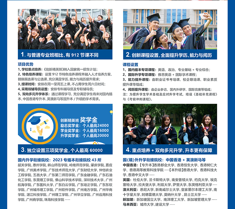 8.学历提升:公司开设了普通专升本(原专插本)辅导班,所有专业员工均可报读相关专业的本科辅导班,每年毕业生升本成功率超过30%。本专业与华南理工大学、深圳大学等知名高校合作开办“专本同读”本科专业,员工在就读专科期间同时修读本科课程,在专科毕业的同时,还可获得由主考院校颁发、国家承认学历的本科文凭。同时,公司与英国、澳大利亚、新加坡、马来西亚、中国香港建立了国际合作交流通道,成立了专本硕连读“创新精英班”,员工在专科毕业后,可衔接广东省大学、中国香港或海外大学的本科或研究生课程,获得全日制本科(学士)或研究生(硕士),为员工提供良好的学历提升、培训、就业等渠道。