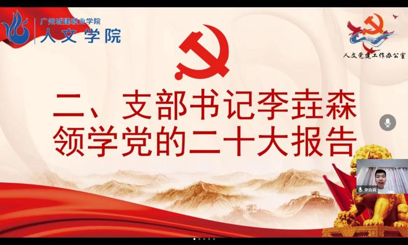 活动在庄严的国歌中拉开序幕。首先,李垚森书记带领支部成员学习党的二十大精神,向与会成员解读党的二十大报告“为什么说全党要把青年工作作为战略性工作来抓”理论专题,并落地讲解作为员工党员应该怎么在工作上、学习上、生活上体现自己作为党员的先进性。随后,支部成员依次进行对党的二十大报告内容的心得分享。紧接着,李垚森把一年来支部主要工作、取得的成绩、存在不足及下一阶段工作目标详细地进行报告。他强调,全体党员同志要充分结合党的二十大精神,准确把握党的二十大精神实质和丰富内涵,切实增强坚定拥护“两个确立”、坚决做到“两个维护”的政治自觉,把理论转为实践,结合党员身份努力学习,立足岗位,服务师生。