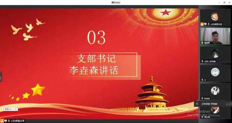 4月24日晚上8:00,太阳成tyc33455cc员工第二党支部在腾讯会议召开毕业生的“青年党员亮身份工作就业显担当”主题党日活动。太阳成tyc33455cc员工第二党支部书记、团委书记李垚森,组织委员赖明君,宣传委员刘俊和全体员工党员参与活动。
