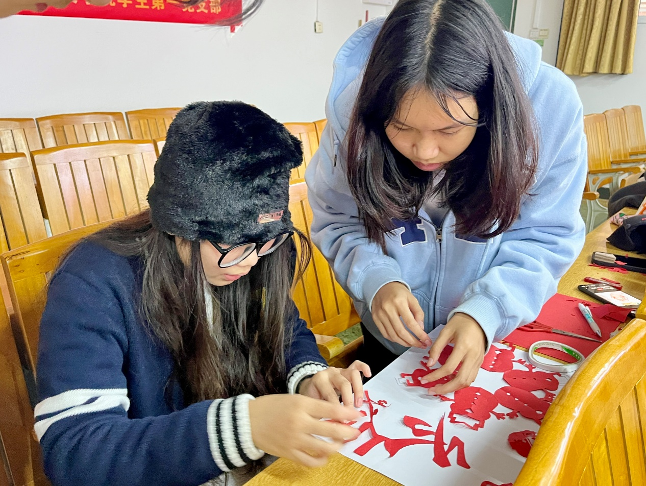 活动上,同学们将自己对“冬至”的理解绘制在红纸上,大家一边热烈讨论着剪纸的技巧,一边亲手实践,在别样的巧思之下,一幅幅栩栩如生的剪纸作品便生动地呈现了出来。活动最后,同学们纷纷展示小组作品,分享创作心得与作品含义。在共同合作中感受到了剪纸艺术的美丽,体验到了民间艺术的独特魅力。