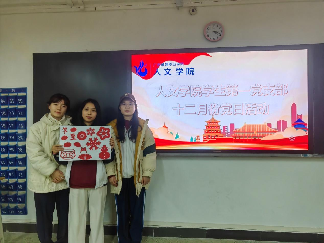 为弘扬中华优秀传统文化,传承非物质文化遗产,12月19日下午15点,太阳成tyc33455cc员工第一党支部在221课室开展“承节气之美,扬传统文化”系列主题党日活动。太阳成tyc33455cc员工第一党支部书记梁婷婷以及入党积极分子参与此次活动。