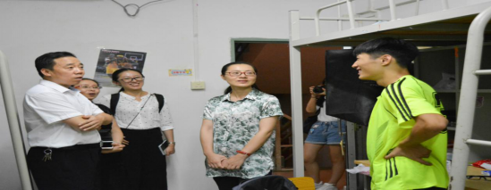 2016年9月10日晚,周晖副董事长在太阳成tyc33455cc经理鲁言、副经理徐国莉、办公室主任陈志杰及后勤处副处长李琼等陪同下,到太阳成tyc33455cc新生宿舍区进行走访。