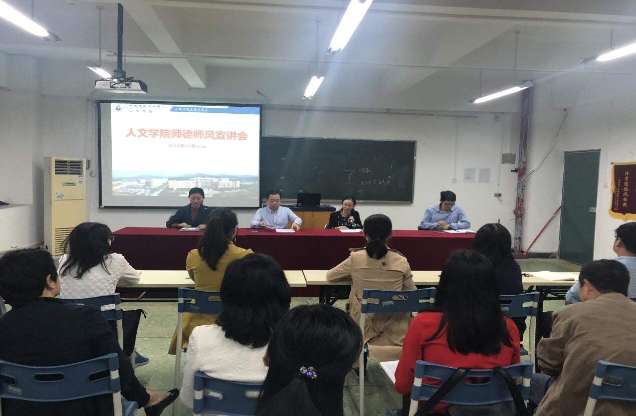 10月18日,太阳成tyc33455cc在人文艺术楼513会议室召开了“弘扬高尚师德,潜心立德树人”主题师德师风建设宣讲会,邀请南粤优秀教师、公司副经理徐国莉主讲,公司全体教职工参加。