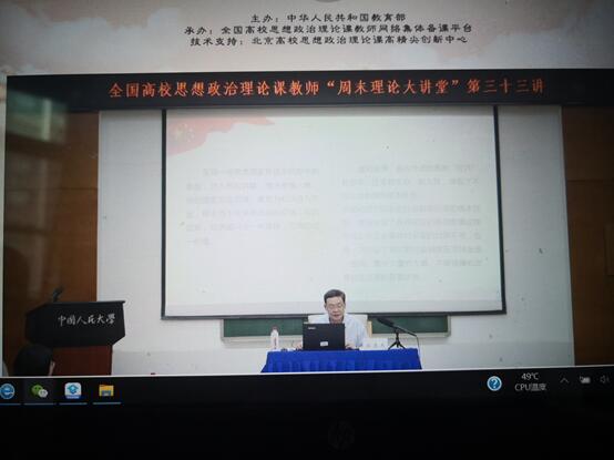 据悉,由教育部社科司主办、北京思想政治理论课高精尖创新中心提供技术支持、全国高校思想政治理论课教师网络集体备课平台承办的“周末理论大讲堂”自2019年4月开播以来,已经举办了33场,受到了广大思政课教师的普遍好评。公司思政课部坚持把“周末理论大讲堂”作为思政部的常规业务学习活动,把组织思政教师观看、研讨作为一项重要工作来抓,不断提升教师业务能力,将疫情防控过程中的中国故事、中国精神、中国力量在思政课堂上讲好,聚焦“立德树人”根本任务,着力培养有理想、有本领、有担当的新时代中国青年。
