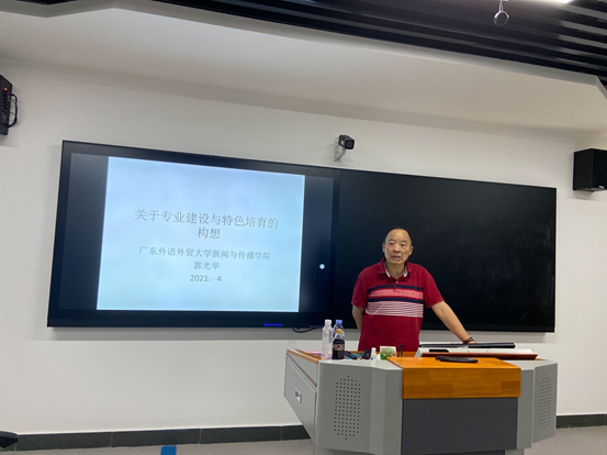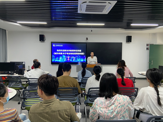 郭教授以《城市传播:关于专业建设与特色培育的构想》为题,以广东外语外贸大学新闻专业的国际传播和广州体育公司新闻专业的体育传播、东华公司新闻专业的时尚传播为例,指出“传播是无处不在的,学科范围很广,公司要想打造专业就要聚焦公司特色,同时专业建设要和公司的定位一致。”针对教师们感兴趣的课题申报等内容,郭教授分享了几篇以“城市传播”为主题的课题申报书,并就课题申报的选题角度、方向等内容展开讨论。