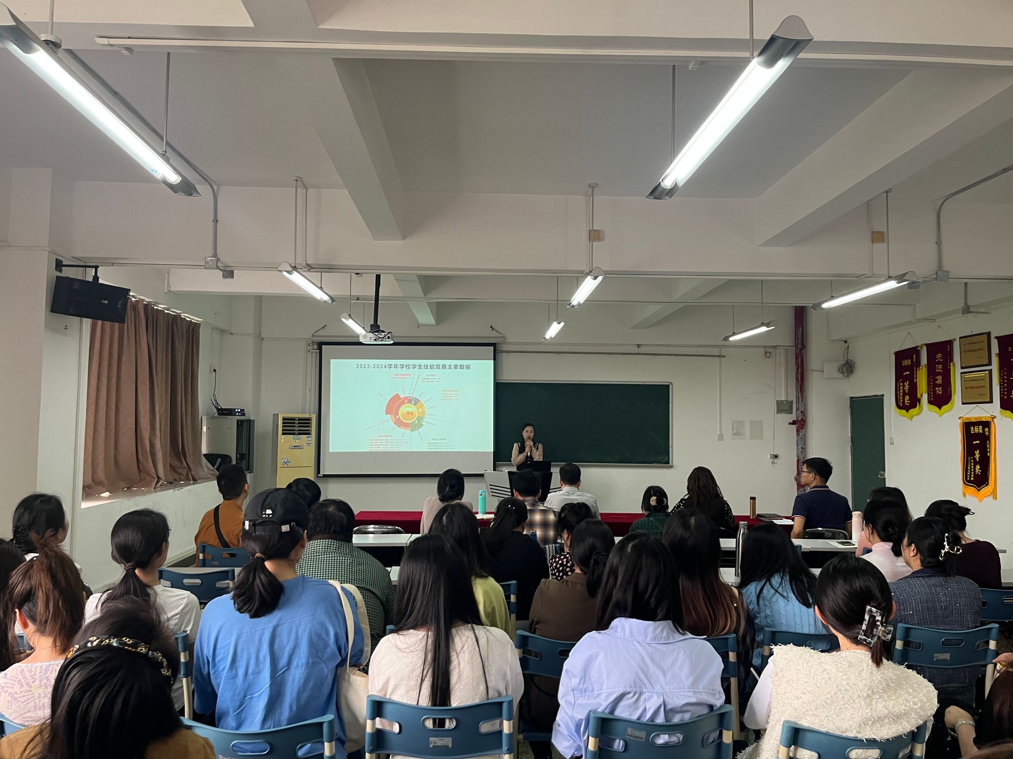 王婧对2023-2024学年员工技能竞赛进行简单总结,通过数据分析、获奖比例、经费投入、获奖数量排名等方面进行剖析,对各教研室、竞赛指导老师的辛勤付出进行肯定。