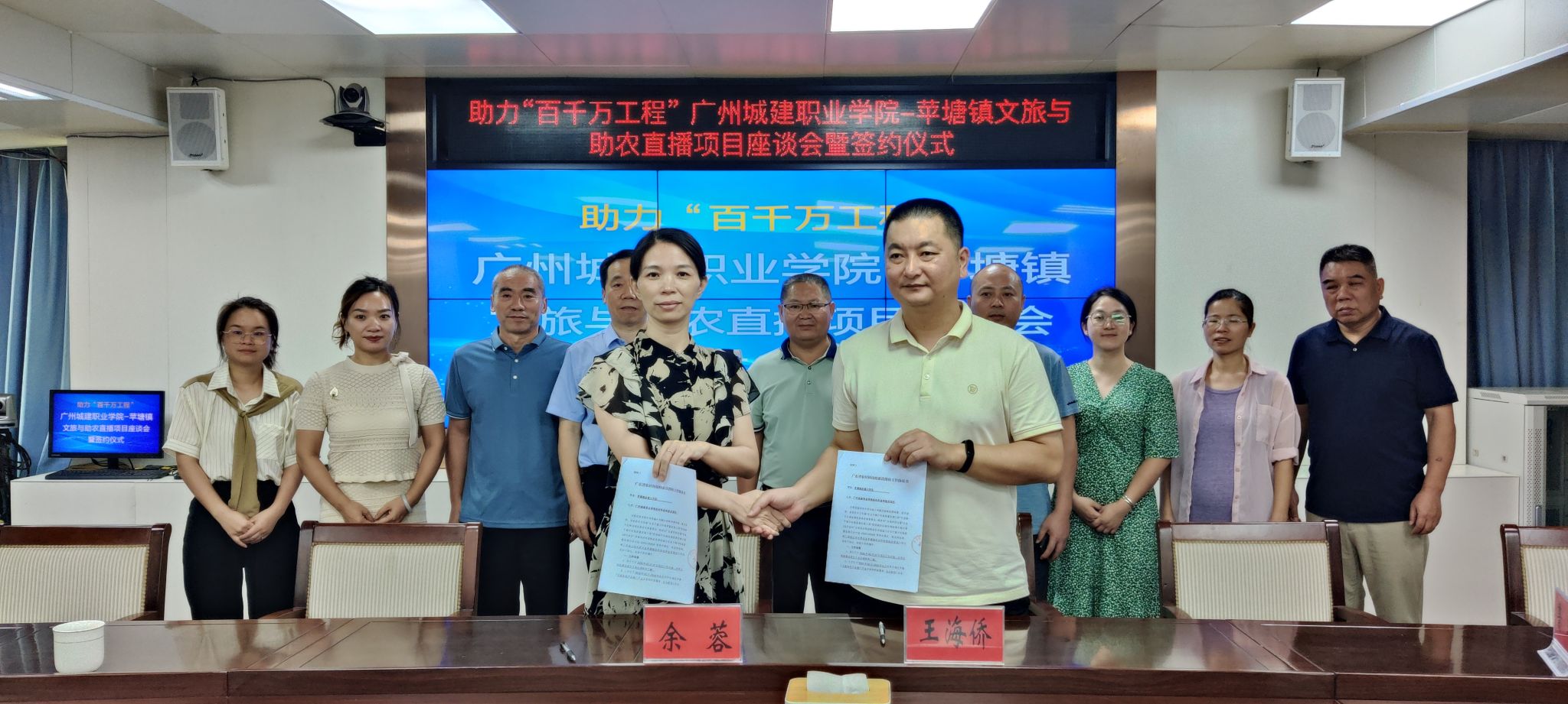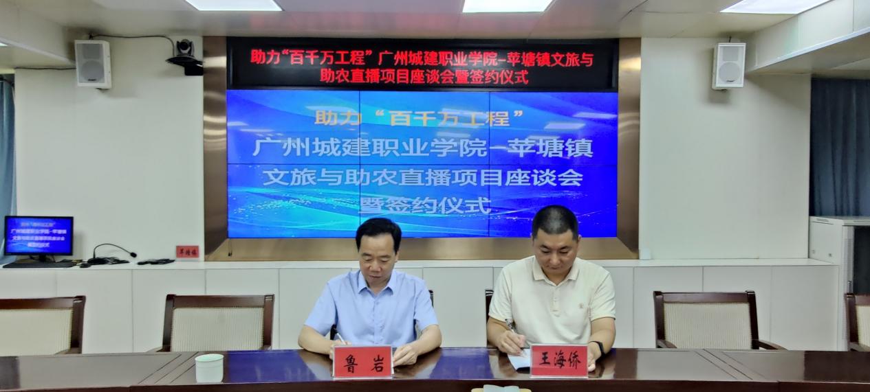 座谈会后,双方举行了签约仪式,鲁岩、余蓉分别与驻镇工作队队长王海侨签订了《苹塘镇乡村振兴人才驿站进驻协议书》和《广东省农村科技特派员帮扶工作协议书》。