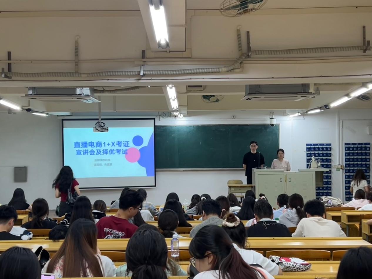 为深入贯彻教育部《国家职业教育改革实施方案》的文件精神,紧密对接行业岗位需求,提升专业人才培养的实效性,9月23日下午,新媒体专业群在人文艺术楼205教室举行“1+X”直播电商(中级)培训开班仪式。新媒体专业群教师谭嘉倩、朱建朋以及网络直播与运营、网络新闻与传播和传播与策划等三个专业近100名同学参加了开班仪式。