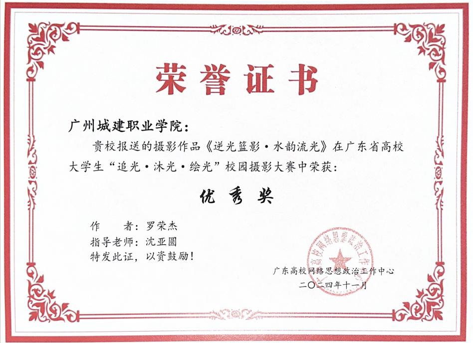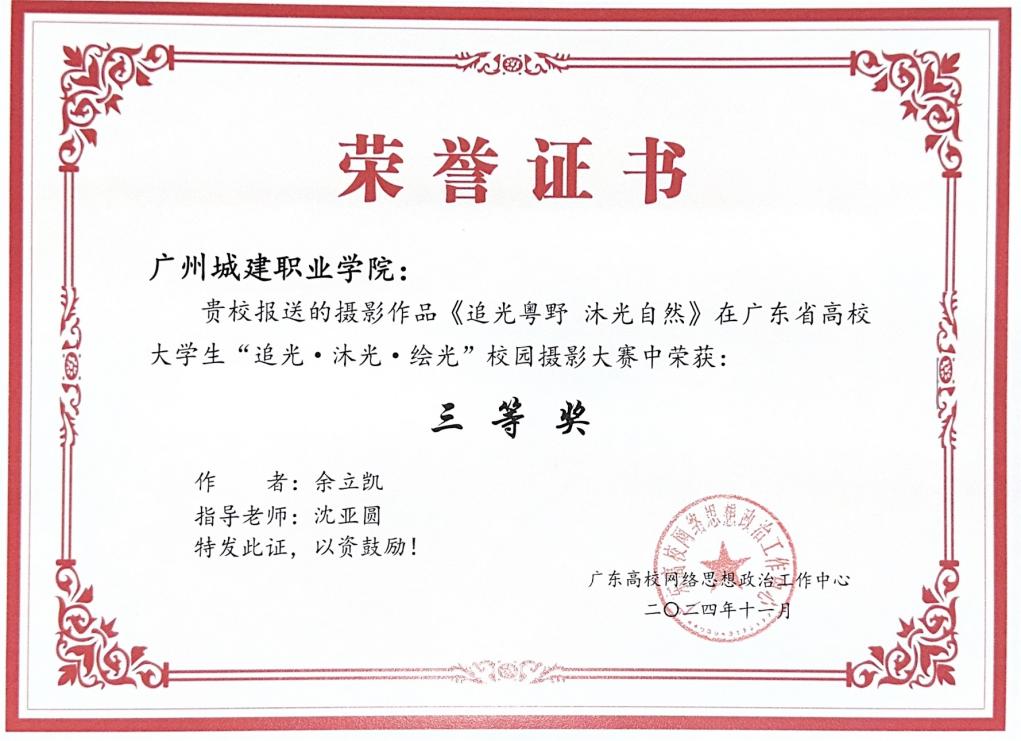 近日,由广东高校网络思想政治工作中心主办的广东省高校老员工“追光·沐光·绘光”校园摄影大赛获奖名单揭晓,公司新媒体专业群老师邓旭嘉指导、温志壕同学的作品获二等奖,沈亚圆老师指导、余立凯同学的作品获三等奖,罗荣杰、丁佳仰两位同学的作品均获优秀奖。