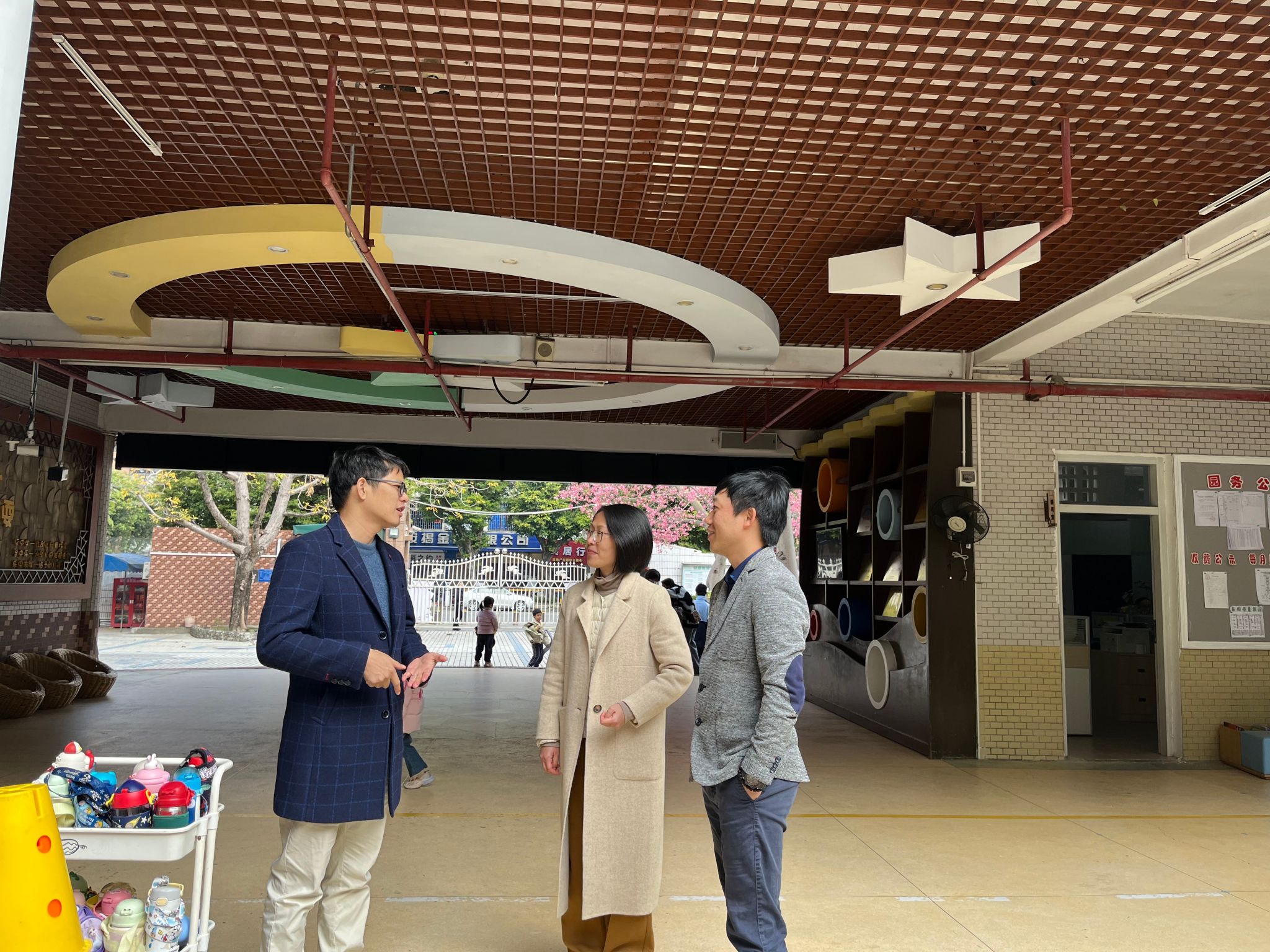 开班仪式后,公司一行在园方的带领下参观了幼儿园的教学环境和员工教育见习的场景等,并就人才培养、课程设置、课题共研等方面做了深入的探讨。