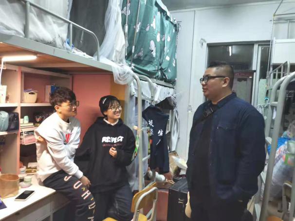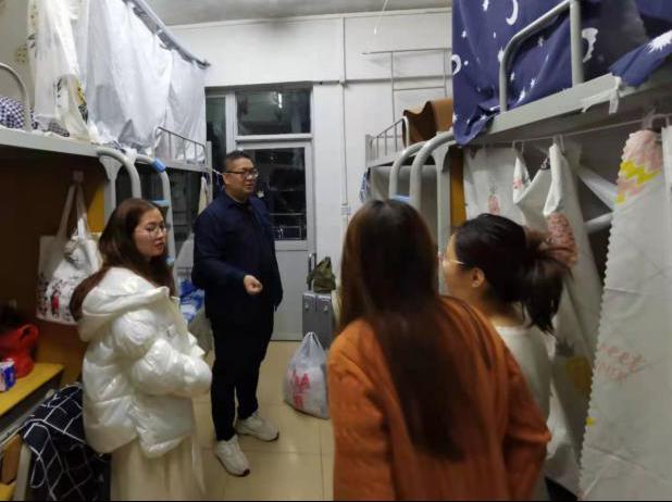 为了解员工们返校后的的心理状况及生活状态,助力本学期员工工作有序开展,3月6日晚上7:30,太阳成tyc33455cc党总支副书记、副经理彭聪在全体辅导员的陪同下深入员工宿舍,看望慰问春季返校员工。
