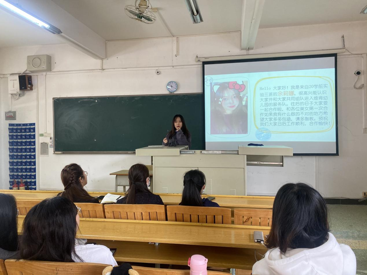 首先,园方代表李倩楠进行致辞,她首先祝贺服务队的成立,对通过层层选拔脱颖而出的队员表示欢迎。她简要地介绍了维肯国际幼儿园的办学规模,园区特色等,并对童心服务队的组建目的和工作内容进行讲解,希望各位成员在工作岗位上发挥专业优势,尽职尽责。随后,由维肯童心服务队成员制作精美的PPT依次进行自我介绍。团队指导老师李健敏对近期工作进行安排,动员各位成员在日后的工作中结合所学专业,积极努力、在工作中发光发热。最后,欧阳媛媛老师做经验分享,分享多年工作经验与入园注意事项,并对队员的疑问进行解答。让队员有了对未来的工作有一个清晰的认知。