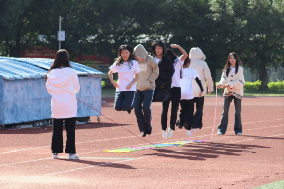 紧接着,19个新生班级迈着矫健的步伐逐一进行班级风采展示。各班级以舞蹈、合唱等多种表演形式体现了团结向上、勇于创新、志在超越的良好精神面貌。班级风采展示后,由各素拓教练带领班级进行“集体跳大绳”、“射龙门”等项目,整个田径场充满着青春的气息。